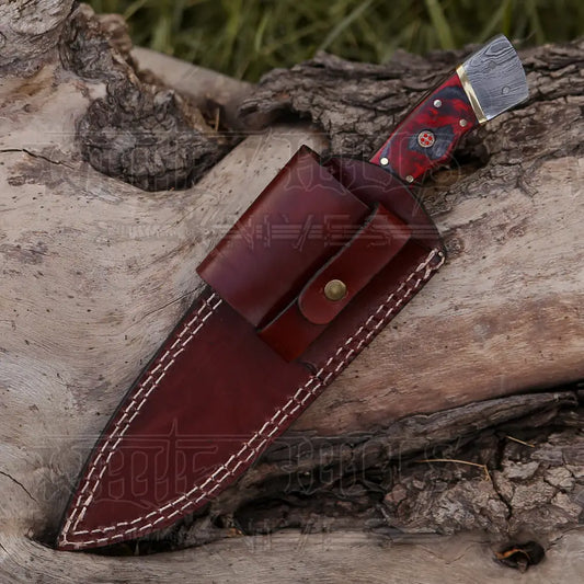 8.5” Hand Forged Damascus Steel Full Tang Skinner Knife - Red Wood Handle - H 021