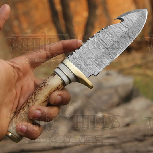 Handmade Forged Damascus Steel Gut Hook Hunting Knife EDC With Orginal Stag antler Handle WH 4340