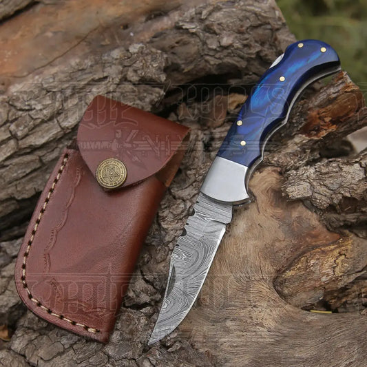 Handmade Damascus Steel Hunting Pocket Knife Camping Folding Blade With Black & Blue Wood Handle WH 4392
