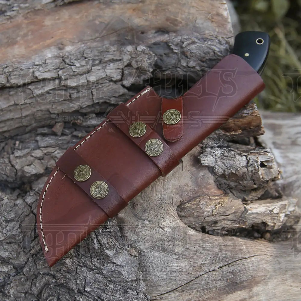 This superb design knife is hand forged. Blade of this knife has a nice file work and is made of 512 layers of stainless steel and high carbon steel with hardness 55-60 HRC. This robust knife is lab tested under intense conditions,; the balance and shape of this knife ensures perfect grip.